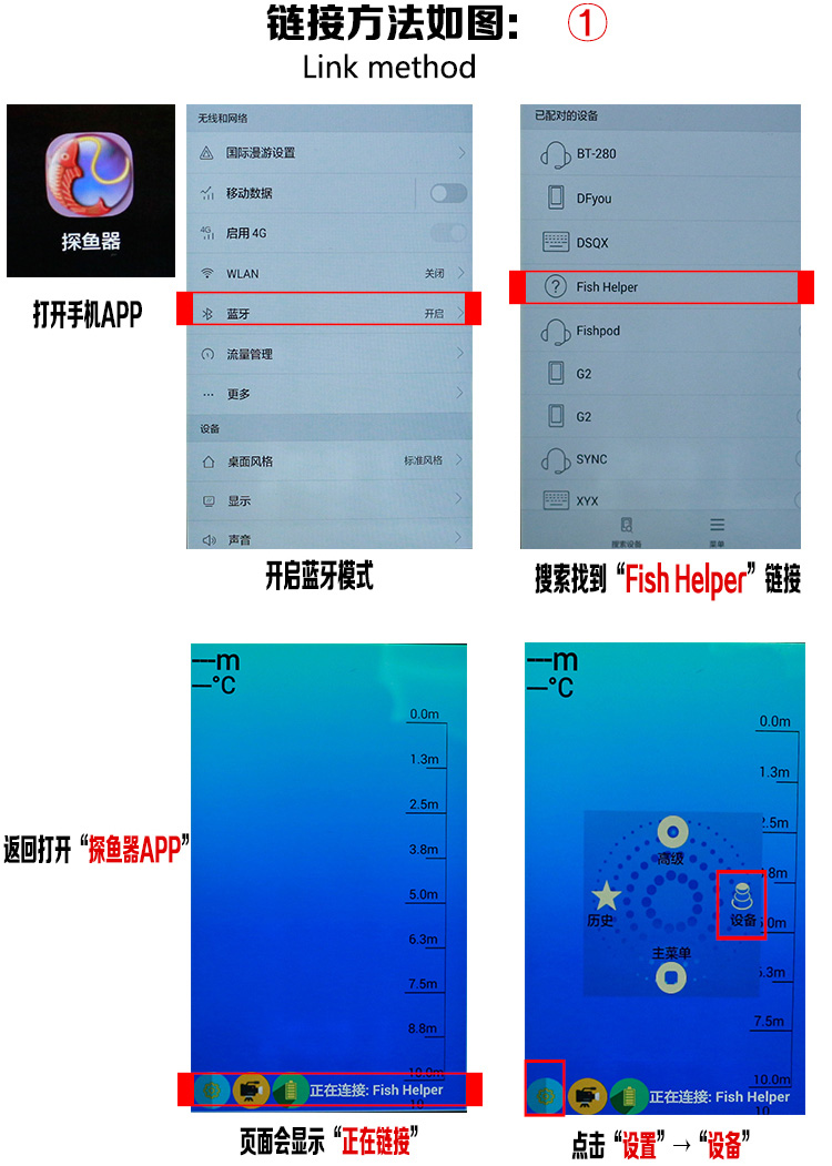 2)蓝牙搜索声纳探鱼器并建立连接;